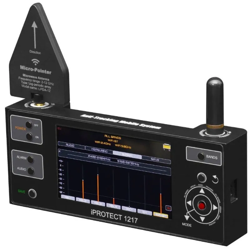 Das iProtect 1217 ist ein neu veröffentlichter (2022) Detektor für mobile und drahtlose Signale, der in der Lage ist, alle Arten von versteckten Geräten zu finden, wie Mobiltelefone, Spionage-Wanzen, versteckte Kameras, versteckte Diktiergeräte, GPS-Tracker, jede Art von geheimen Überwachungsgeräten, die mobile Kommunikation nutzen und Signale aussenden.