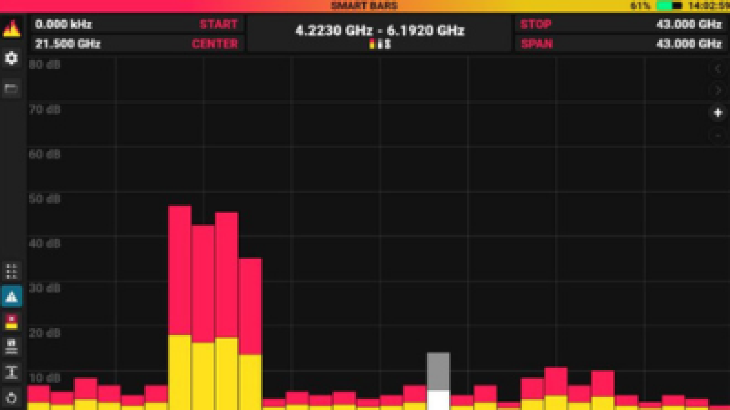 OSCOR MAX umfasst fortschrittliche Werkzeuge wie SmartBars™, Discrete Bands, Persistenz, Wasserfallanzeigen und Langzeit-Spektrogramme. Diese Visualisierungsmodi helfen dabei, normale Hintergrundaktivitäten schnell von verdächtigen oder nicht autorisierten Signalen zu unterscheiden. Der Spektrumanalysator kann einzelne WLAN- und Bluetooth-Geräte erkennen und identifizieren sowie Tracendaten analysieren und vergleichen, um Unterschiede darzustellen. Zudem werden Live-, Durchschnitts-, Peak-Hold- und mehrere gespeicherte Tracen angezeigt. Der Spektrogramm-Wasserfall zeichnet Peak-Tracen über längere Zeiträume zur historischen Analyse auf, während die patentierte SmartBars™-Anzeige neue Signale oder erhöhte Energie im Vergleich zu einer gespeicherten Referenztrace in Form eines übersichtlichen Balkendiagramms darstellt. Die Funktion Discrete Bands zeigt bis zu 16 vorkonfigurierte und individuell anpassbare Spektralsegmente an.