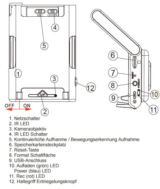 - Zum Aufnehmen mit IR schieben Sie den "IR Power Switch" (Nr. 4 wie in der obigen Abbildung)