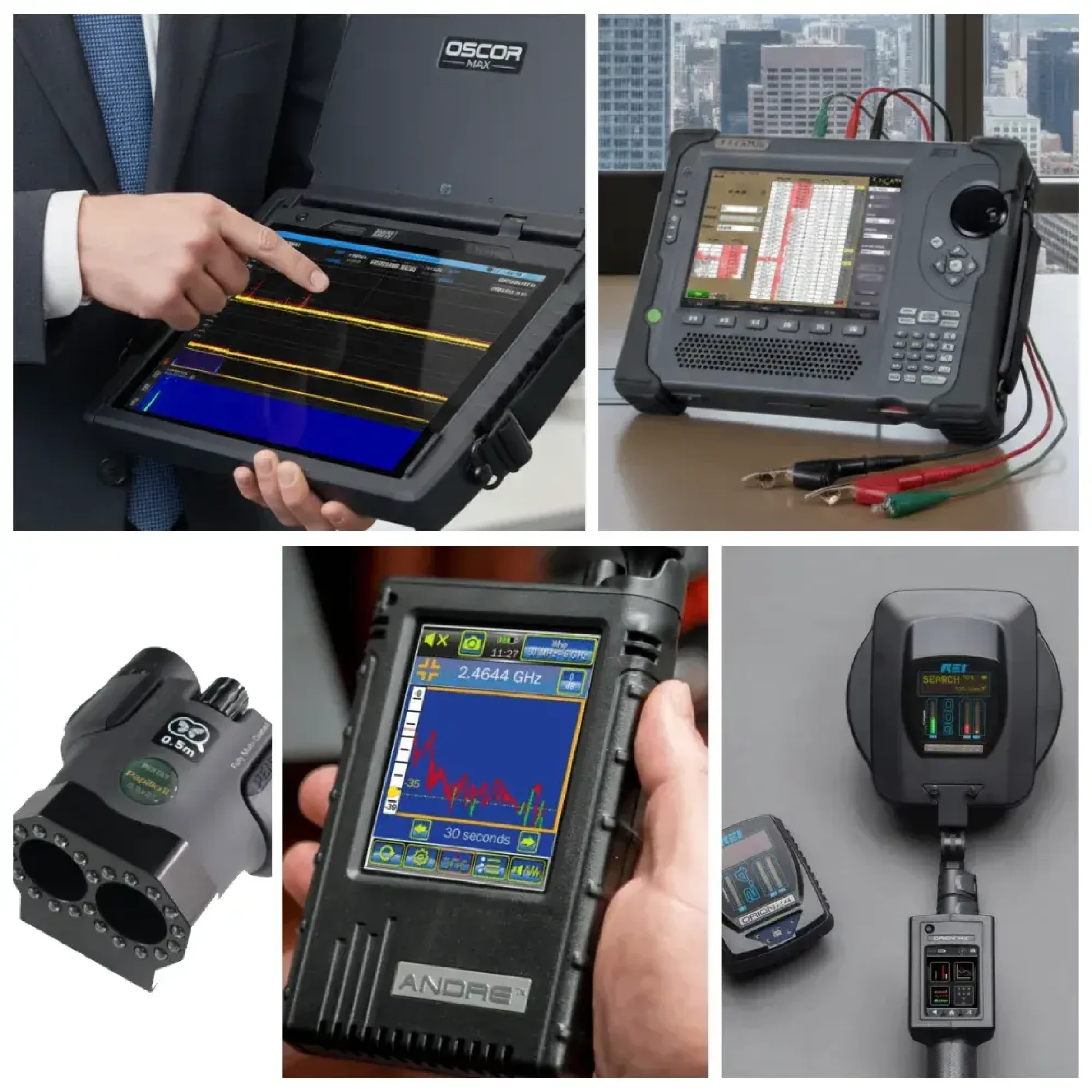Der OSCOR Max scannt HF-Aktivitäten von 10 kHz bis 43 GHz. Der ANDRE Deluxe erkennt Emissionen über mehrere Frequenzbereiche, abhängig von der verwendeten Sonde.