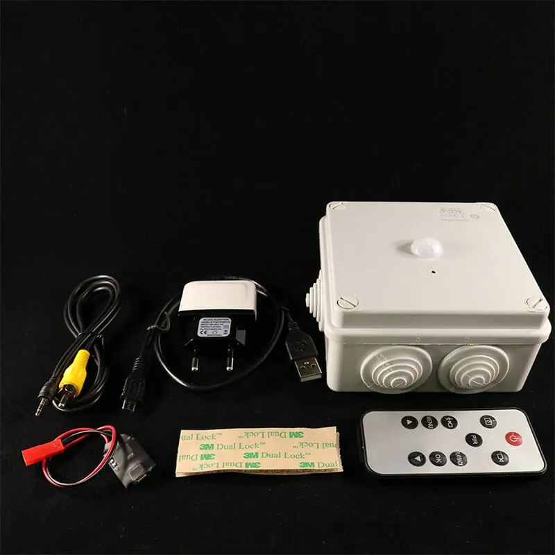 Das Paket enthält die versteckte Kamera in einer Anschlussdose, eine Fernbedienung, ein Videokabel, ein Ladegerät und einen 11000-mAh-Akku. Dieses umfassende Paket stellt sicher, dass der Benutzer alles hat, was er braucht, um die Kamera sofort zu benutzen, mit Ausnahme der SD-Karte, die separat erhältlich ist.