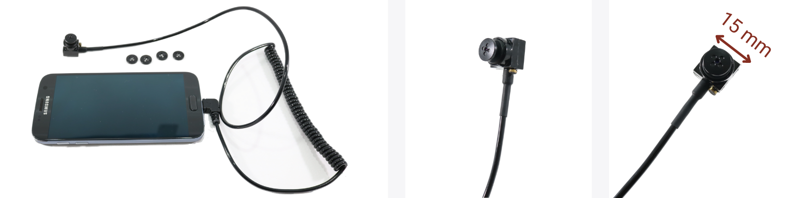 With 15*15*18 mm it can be easily hidden and body-worn. The usage is simple, just connect it to the spy phone, and select the external camera in App.