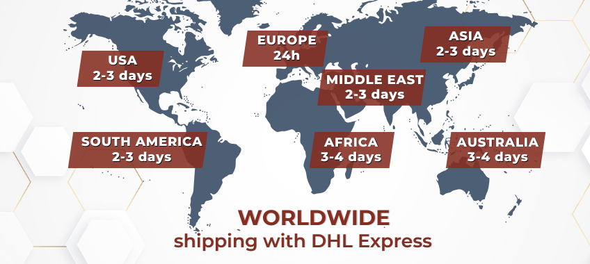 We offer free DHL Express shipping worldwide. Until today, we have shipped to almost every part of the world. We are dedicated to preparing and sending your order the same day you place it. We pack your order with special care and as discreetly as possible - without mentioning our name or brand on the outside of the delivery box. We can also deliver to a DHL Service Point of your choice, just let us know by writing down the address of the Service Point when placing your order. If you prefer to receive your order at home or at your office, we can do that too.